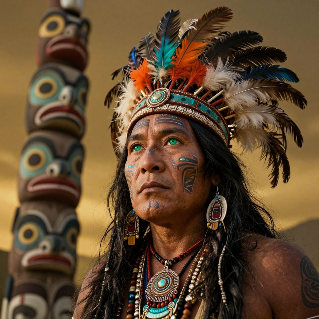 A hyperrealistic portrait of an enigmatic shaman with piercing green eyes, adorned in intricate tribal markings and a vibrant headdress crafted from iridescent feathers. The scene is bathed in a soft golden light emanating from an ancient totem pole, casting dramatic shadows that highlight the subject's weathered features. Captured from a low-angle perspective, this image captures the spiritual bond between the shaman and their mystical environment, evoking a sense of awe and reverence as one glimpses into the ethereal world of ancient wisdom.