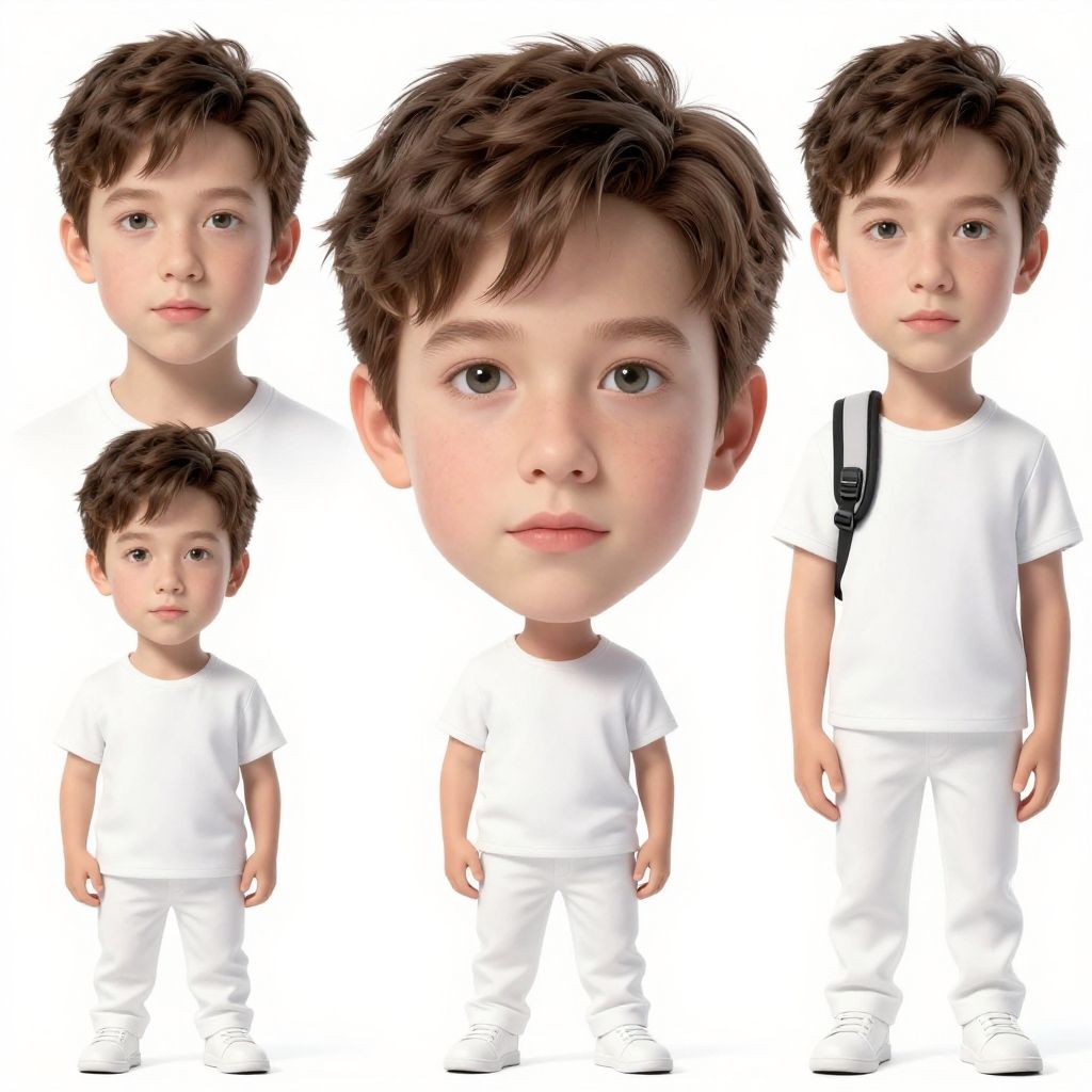 Digital 3D character model of a cute young boy with brown hair, large eyes, wearing a white shirt, pants, and shoes, shown from