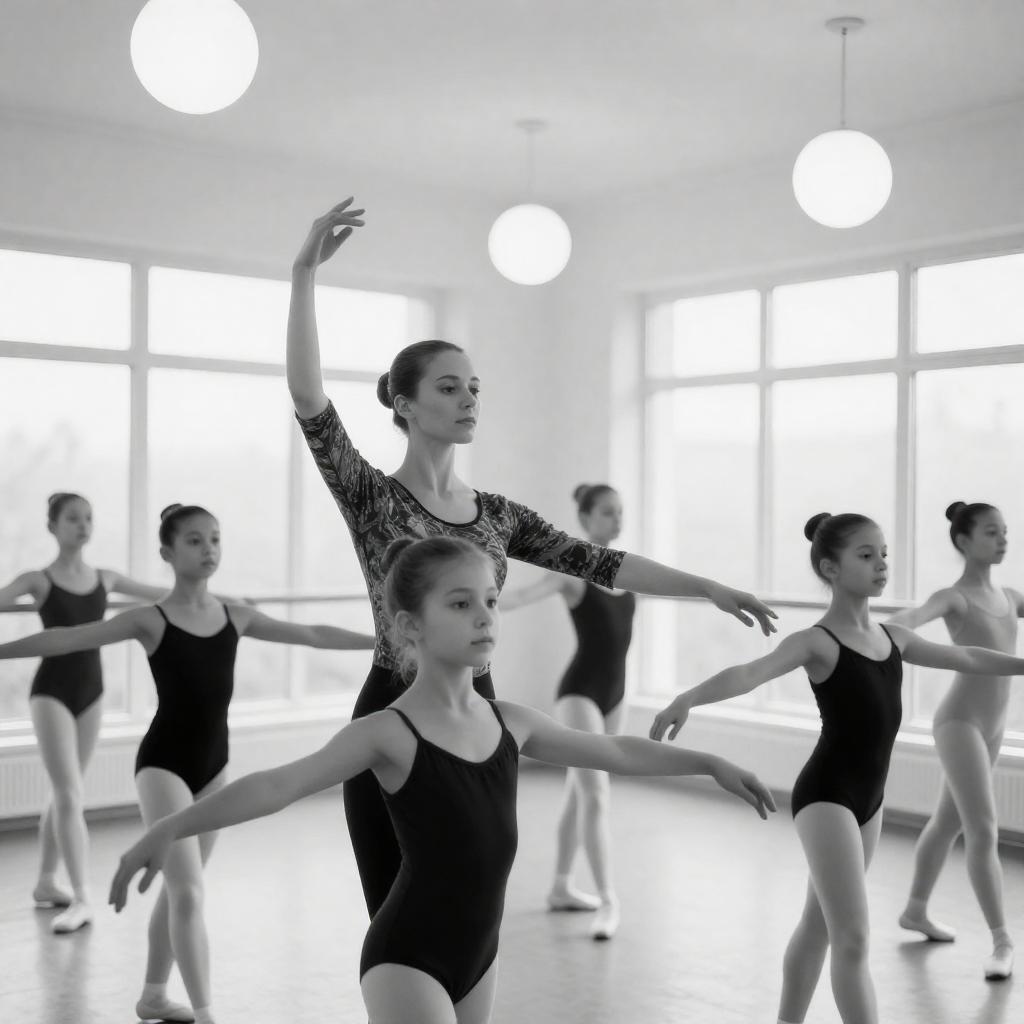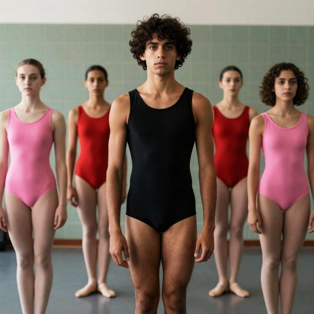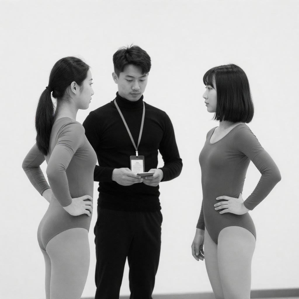 Black and white photograph of three people. Two women with long hair in tight, long-sleeve leotards, hands on hips. One woman with ponytail, other with bob cut. Man in black turtleneck, hands together, badge around neck. All facing left, man looking down. Bright background, minimal shadows.