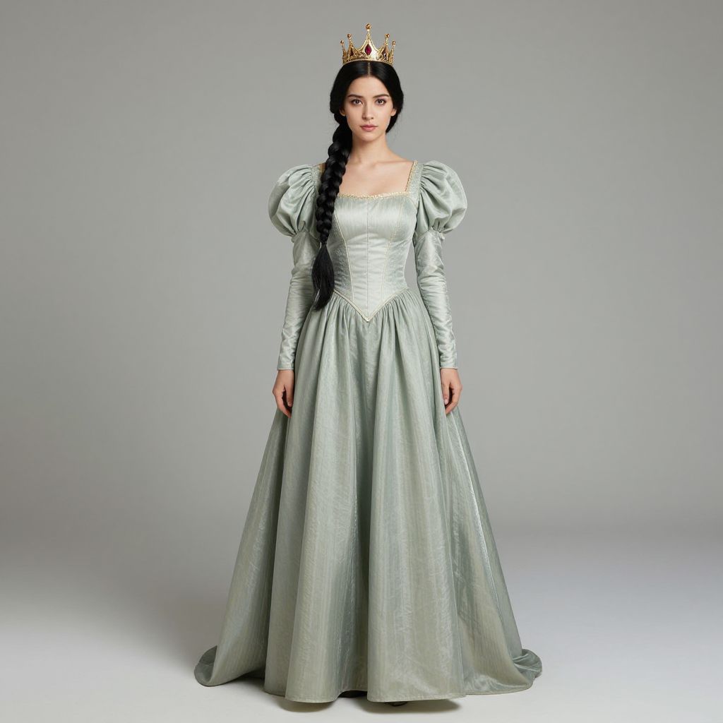 Photograph of an Asian woman with long black hair in a braid, wearing a silver, floor-length, long-sleeved gown with puffed shoulders and a fitted bodice. She has a gold crown with jewels on her head. The gown is made of a shiny, satin-like fabric, and her expression is calm and composed. The background is a plain, light gray studio setting, emphasizing the subject. The woman stands centered, with her arms relaxed by her sides, and the gown's skirt flares slightly at the bottom.