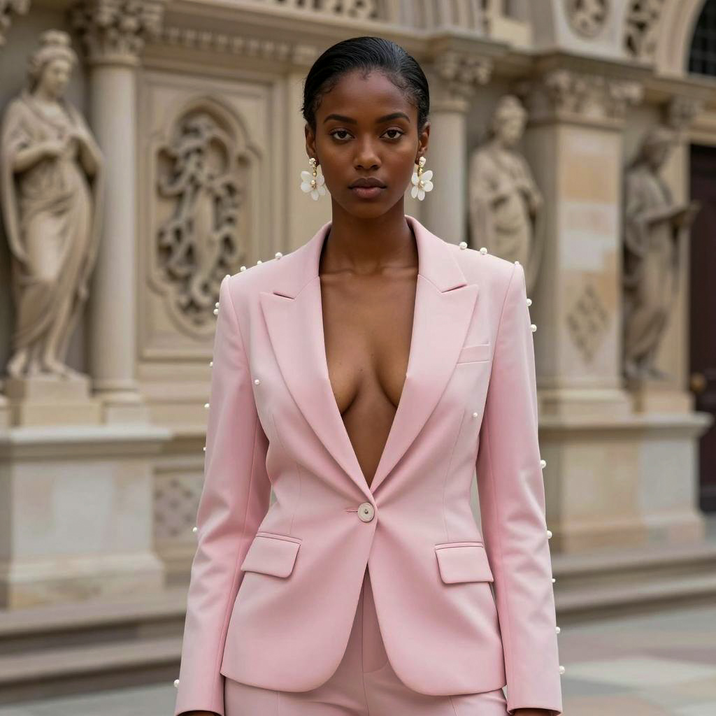 Photograph of a woman with dark skin and slicked-back hair wearing black sunglasses, a pink puffer jacket, pink high-waisted pants, and pink high-heeled boots with zippers. She is sitting on light wood steps, leaning slightly forward. The background is a plain white wall. Her hands are resting on her thighs.