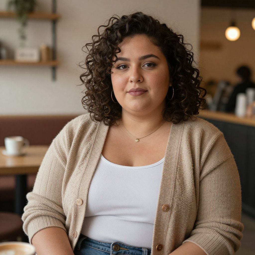 Casual plus size birthday, 1girl, solo, party hat, shirt, hat, candle, white shirt, long hair, looking at viewer, realistic, brown hair, jewelry, smile, earrings, collared shirt, upper body, blurry, blurry background, long sleeves, indoors