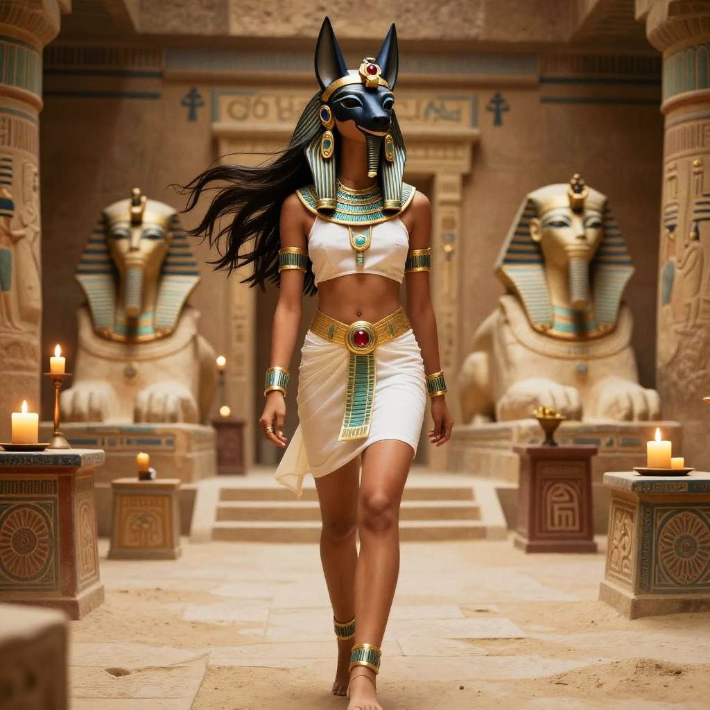 Ancient Egyptian queen in pyramid courtyard under warm twilight, wearing beaded linen dress with ornate gold jewelry, holding a majestic raptor companion, surrounded by lush blooms and carved stone, opulent yet grounded, ultra detailed textures, luminous skin, soft cinematic lighting with subtle rim light and haze, rich scarlet and silver accents, reflective surfaces, atmospheric depth, bokeh highlights, shallow depth of field, refined elegance, masterful realism, high clarity, cinematic framing, storytelling composition