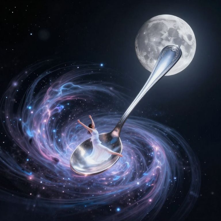 In a surreal cosmic ballet, a colossal silver spoon gracefully stirs a luminous vortex of swirling energy, evoking a profound sense of wonder and existential mystery beneath the watchful gaze of the moon.