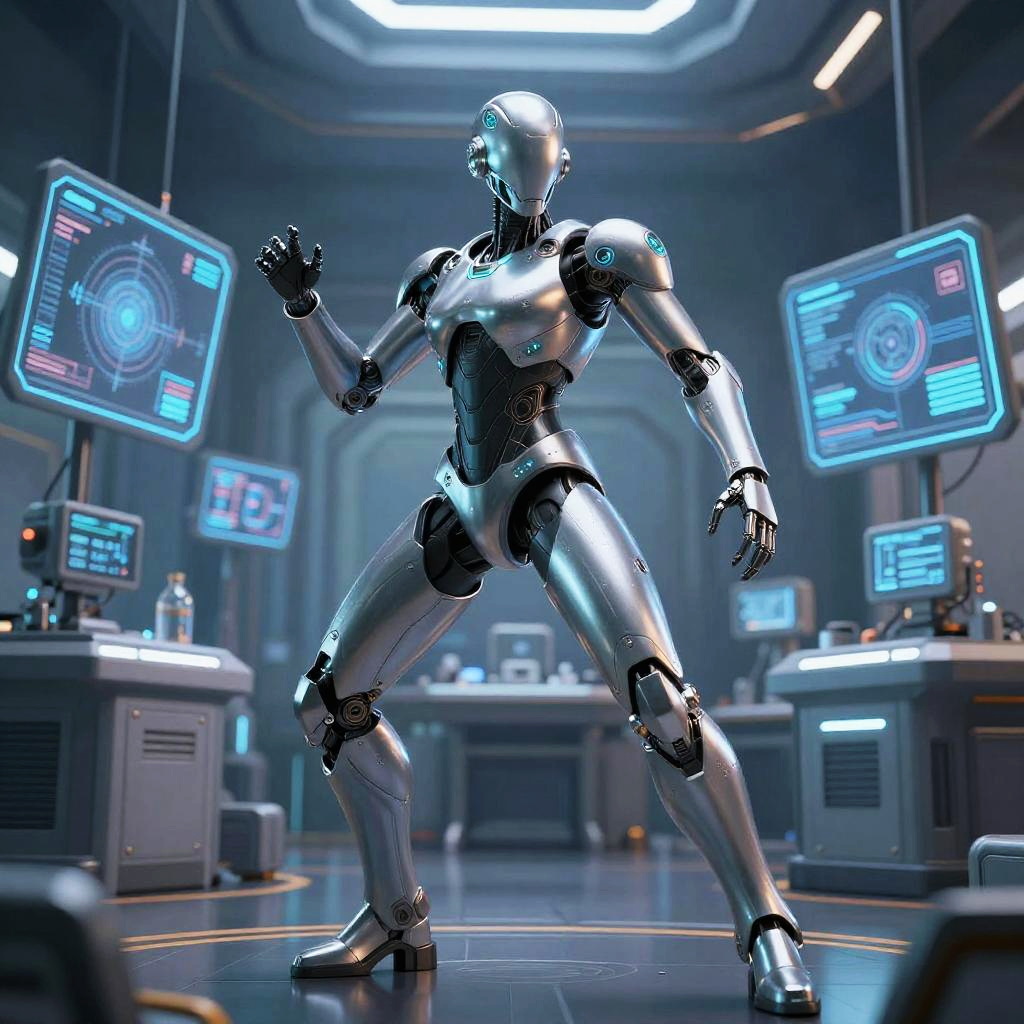 CGI image of a shiny silver humanoid robot in a futuristic lab, standing with a fighting stance, surrounded by glowing blue tech screens.