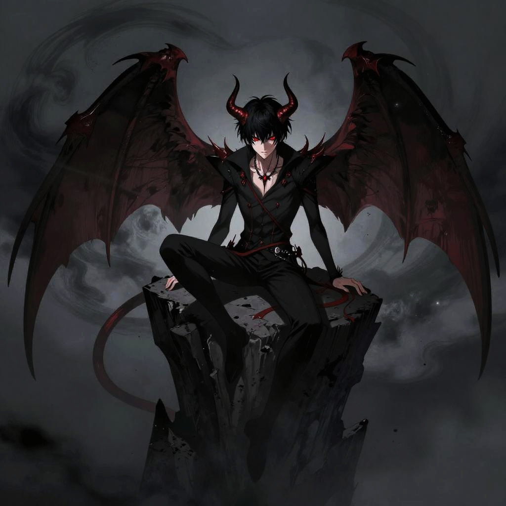 Black hair anime demon boy perched on a jagged cliff, long shadow stretching beneath, crimson eyes gleaming, large demonic wings partially spread, dark aura swirling, gothic fantasy theme, ultra-detailed anime illustration with moody lighting.