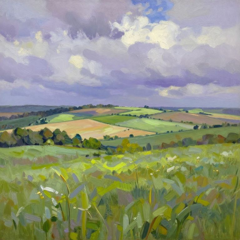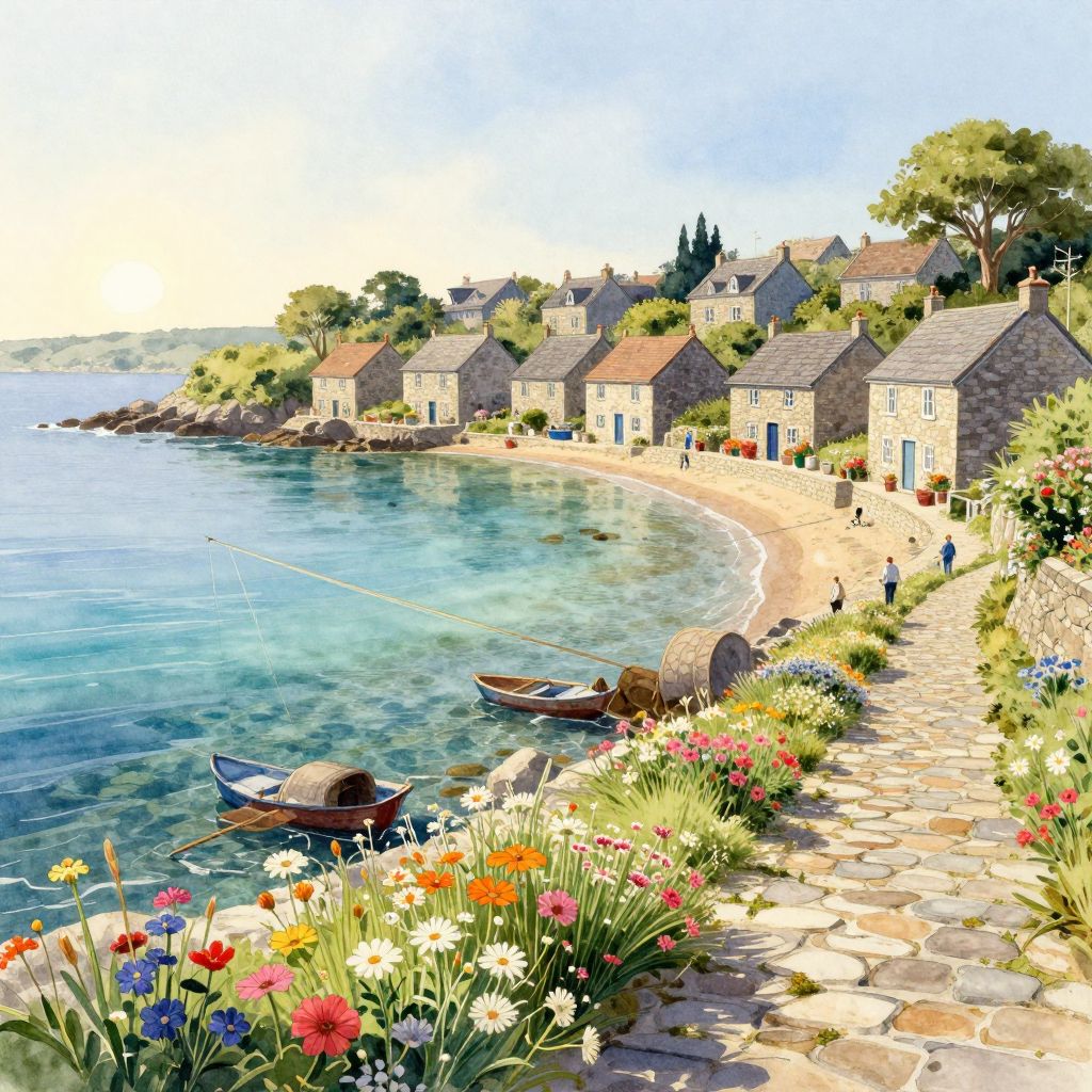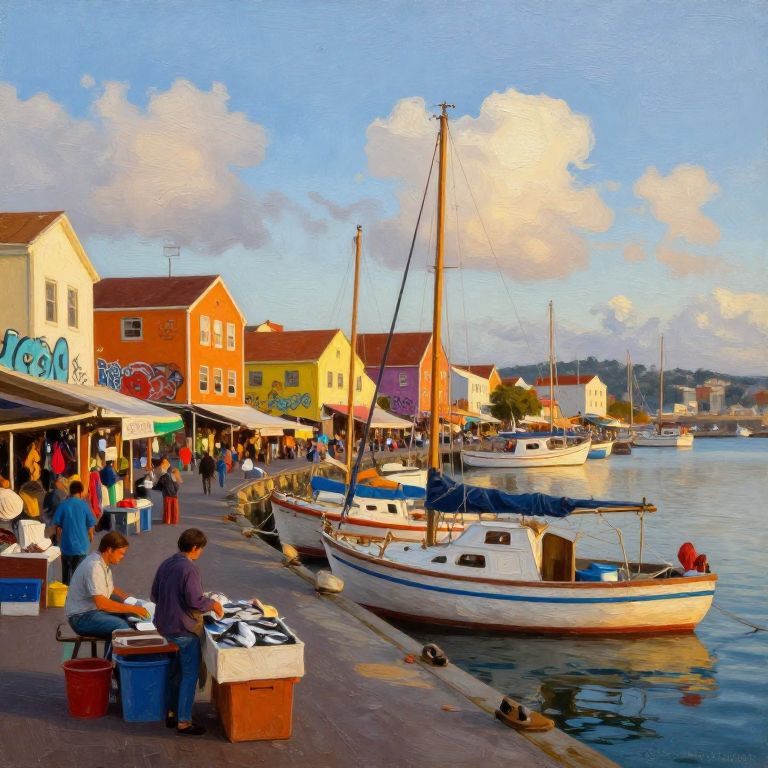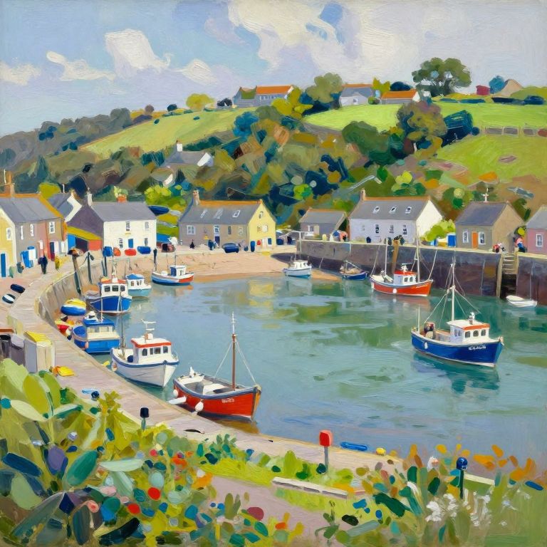 Pembroke coastal landscape with a peaceful harbor filled with colorful fishing boats, quaint docks, and lush greenery, captured in vibrant impressionist brushstrokes.