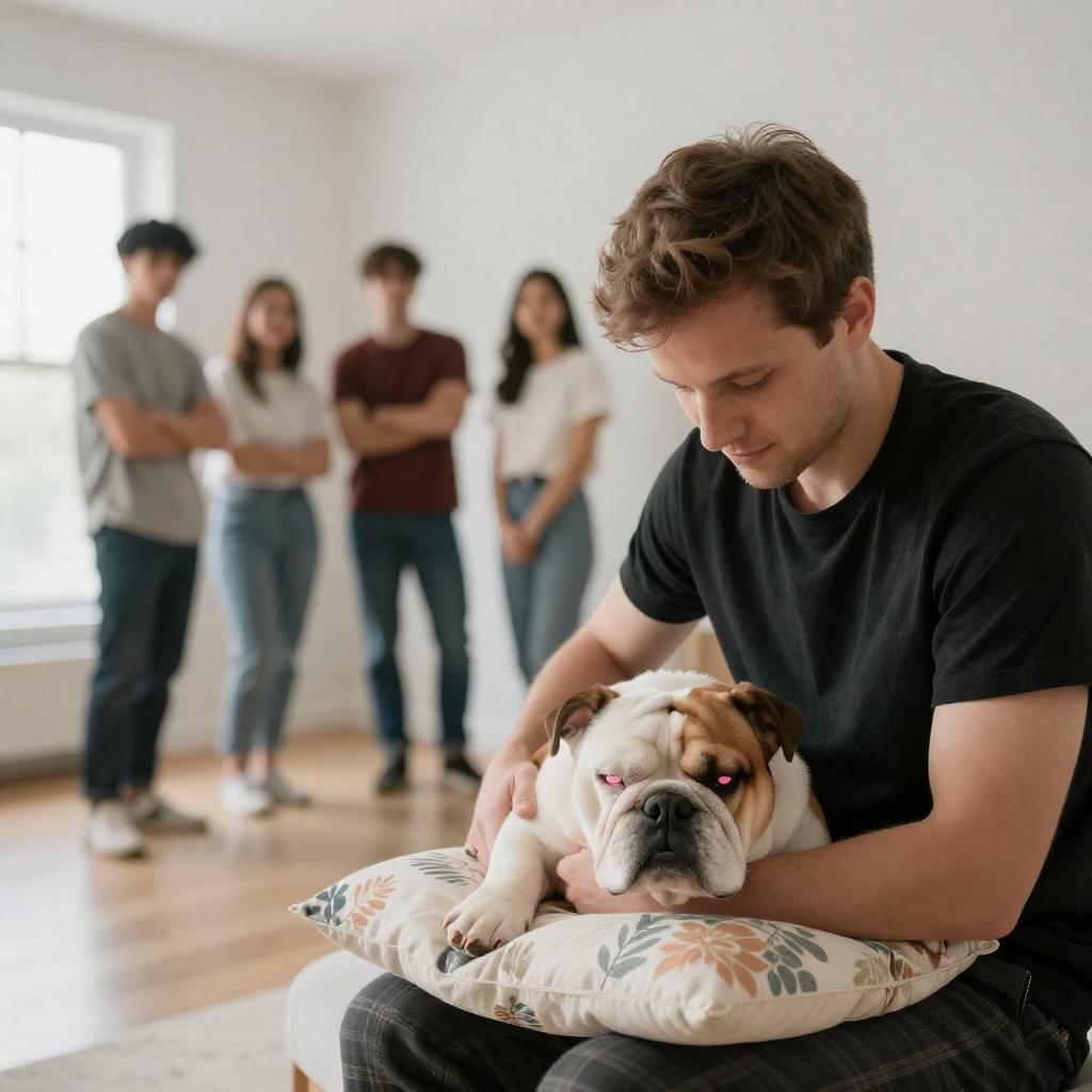 Photograph of a man with short brown hair, wearing a black shirt and plaid pants, gently holding a small, sleeping bulldog on a floral-patterned pillow. In the background, four people stand in a modern, well-lit room with white walls, wooden floor, and a large window. The bulldog has pink eyes and a relaxed expression.