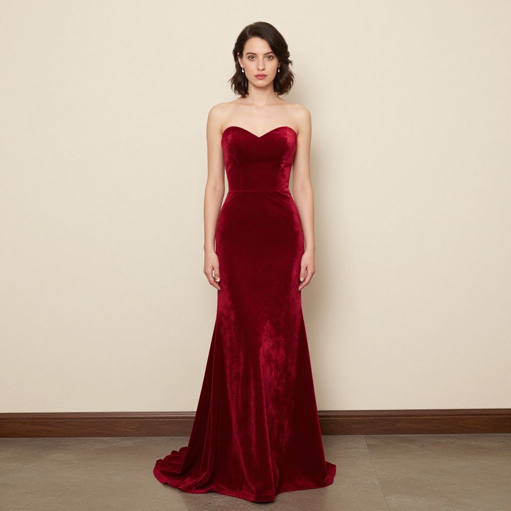 "Velvet Wedding Dress, a woman in a red dress standing in front of a wall"