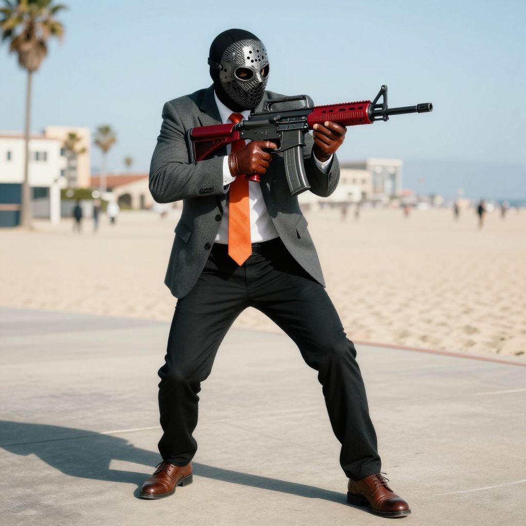 Front 3/4 view portrait of a Armored bank robber handling a metallic red and matte grey assault rifle.The robber is masked with a carbon fiber hockey mask.The robber wears a smart attire. Grey smart jacket, black smart pants, brown smart shoes, brown leather driving fingers-less gloves, bright orange tie on a white office shirt.Dynamic, action, shooting pose.Background of a sunny day at Venice Beach, Los Angeles, California. Many details everywhere. Ray-Tracing. Anti-Aliasing. Realistic reflections. Realistic soft shadows. Slightly desaturated colors. Insane quality. Insane resolution. Insane details. Masterpiece. 16k resolution. Dynamic shot by Simon Stalenhag.