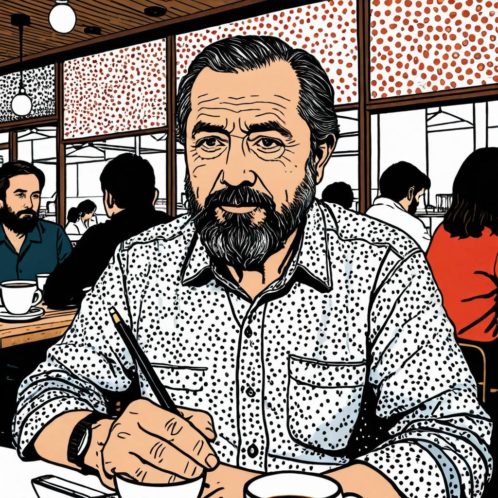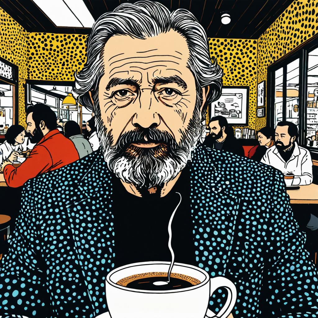 Illustration of a middle-aged man with a beard and slicked-back hair, wearing a white shirt with black polka dots, sitting in a busy coffee shop during daytime. The image uses pen and ink style with flat colors and cinematic lighting, inspired by Yayoi Kusama. The background features various people engaged in conversations and coffee shop decor.