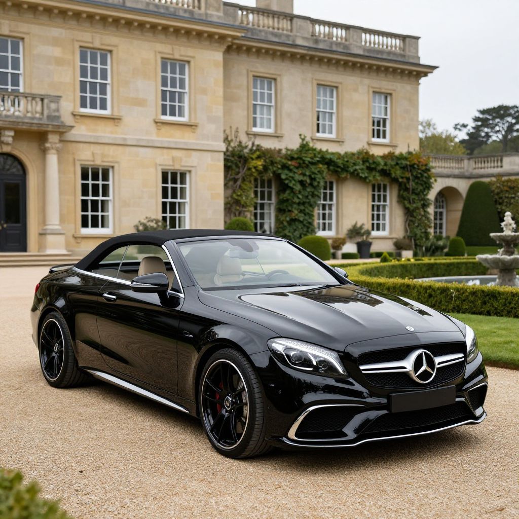 Photograph of a sleek, black Mercedes-Benz convertible with shiny chrome accents parked on a gravel driveway in front of a grand, beige, stone mansion with