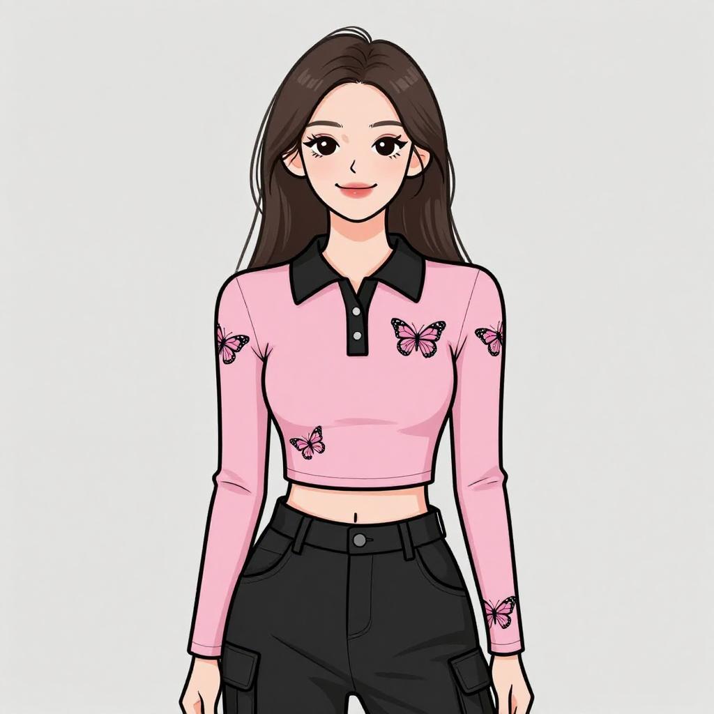 Woman with pretty face and pretty hair. smiling Woman, contemporary casual, fitted pink polo shirt with black collar, butterfly print across the chest and sleeves, long sleeves, black high-waisted cargo pants with belt loops and pocket details, photo studio background --sref 1467