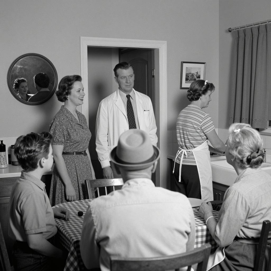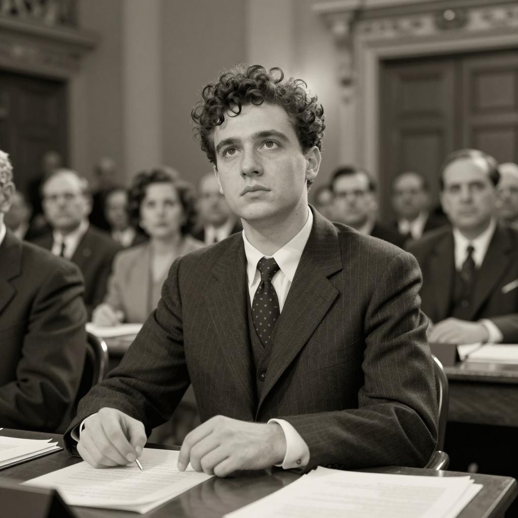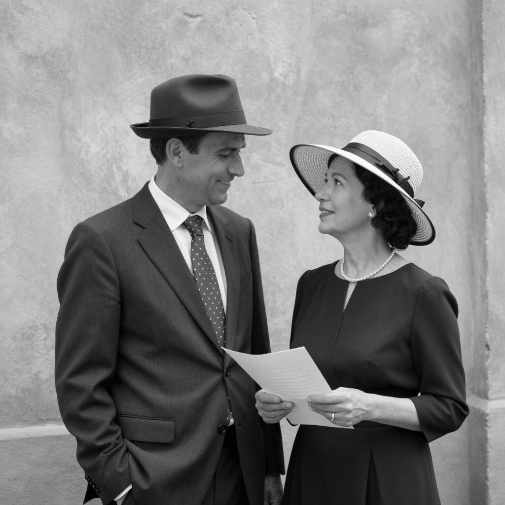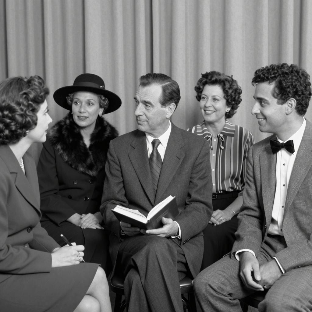 Black and white photograph. Four people seated. Man in center, wearing suit and tie, holding book, looking at woman with fur collar and black hat. Woman with short curly hair, striped blouse, smiling. Man on right, wearing checkered suit, bow tie, smiling. Woman on left, holding pen, looking at woman with fur collar. Curtains in background. All subjects engaged in conversation.