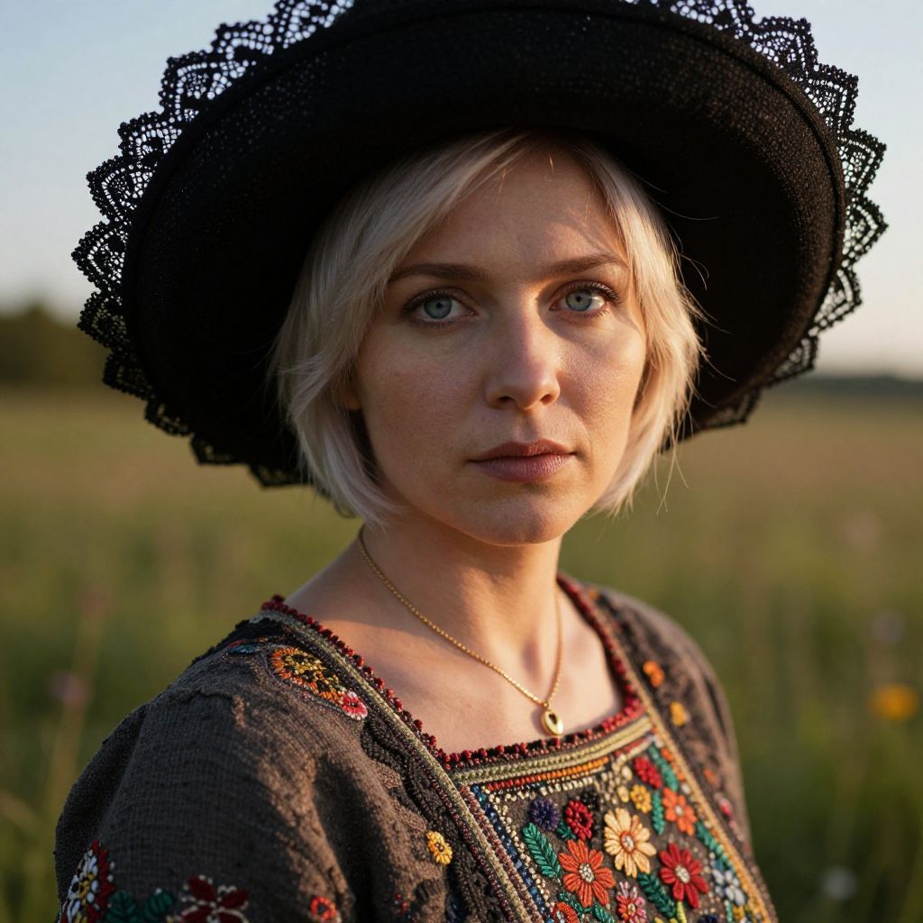 A photorealistic portrait of a Slavic woman in her mid-thirties showcases piercing blue eyes and short platinum hair. She peers pensively from beneath a wide black hat adorned with delicate lace trim. The scene unfolds in a sun-dappled meadow, bathed in the warm glow of the setting sun, casting intricate shadows across her striking features. Captured from an unusual worm's-eye view perspective, the portrait emphasizes the rich textures of her vintage hand-embroidered linen dress and delicate gold necklace, which gleam in the light. This mesmerizing moment evokes a captivating blend of nostalgia and intrigue.