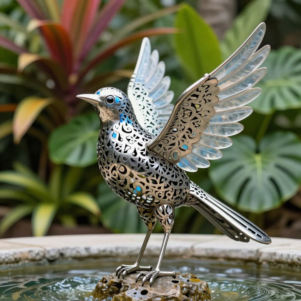 A detailed metallic bird sculpture standing in a small garden fountain, featuring intricate cut-out patterns and translucent wing feathers. The sculpture displays a combination of silver and blue hues with light reflections, surrounded by lush green and colorful tropical plants in the background.