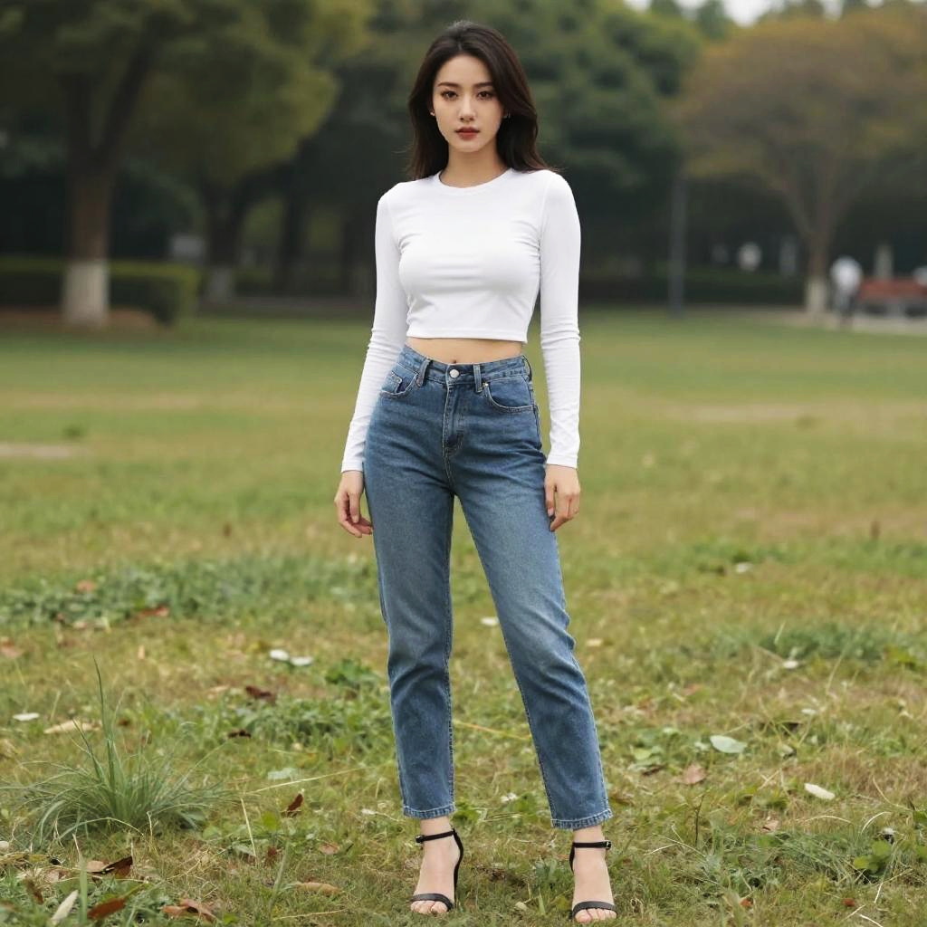 A Pear-shaped body type woman in casual streetwear, wearing a fitted white long-sleeve crop top and high-waisted acid-washed jeans, stands in a scenic park with open meadows. She completes her look with open-toe black high heel sandals. The visual style is reminiscent of production IG. Sexy. Pretty face and beutiful eyes