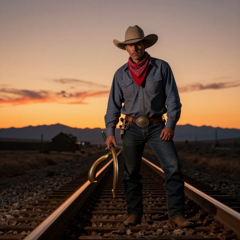 Photograph of a rugged Caucasian man standing on railroad tracks at sunset. He wears a wide-brimmed cowboy hat, blue checkered shirt, red bandana, and blue jeans, with a large silver belt buckle. He holds a golden lasso in his right hand. The background features a vibrant orange and purple sunset sky, silhouetted mountains, and scattered clouds. The rocky ground and railroad tracks add to the western setting. His serious expression and confident stance enhance the cowboy theme. The lighting creates a dramatic contrast, highlighting his figure against the colorful sky.