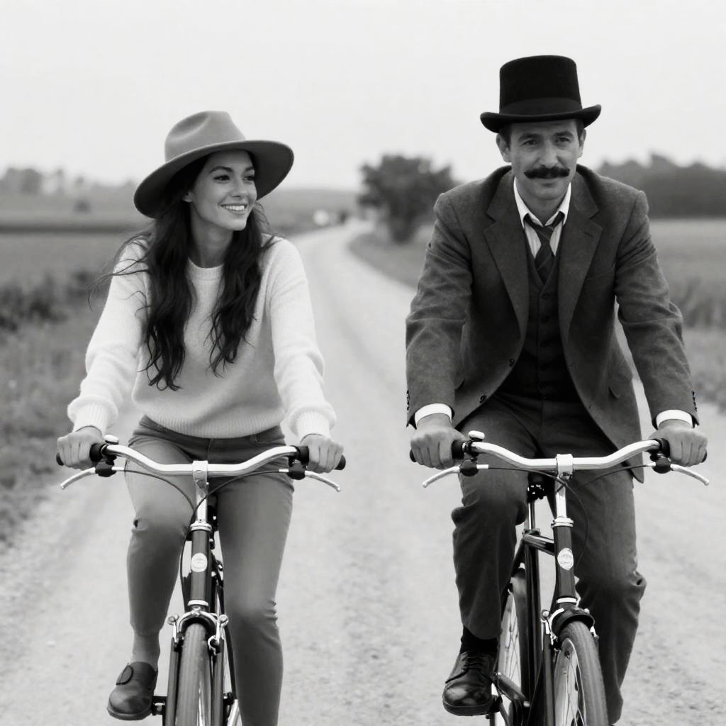 Black and white photograph of a man and woman riding a bicycle. The woman on the left has long hair, wears a wide-brimmed hat and a light-colored sweater, smiling. The man on the right has a mustache, wears a top hat and a suit, holding the bicycle handlebars. They are on a dirt road with a slight incline in the background.
