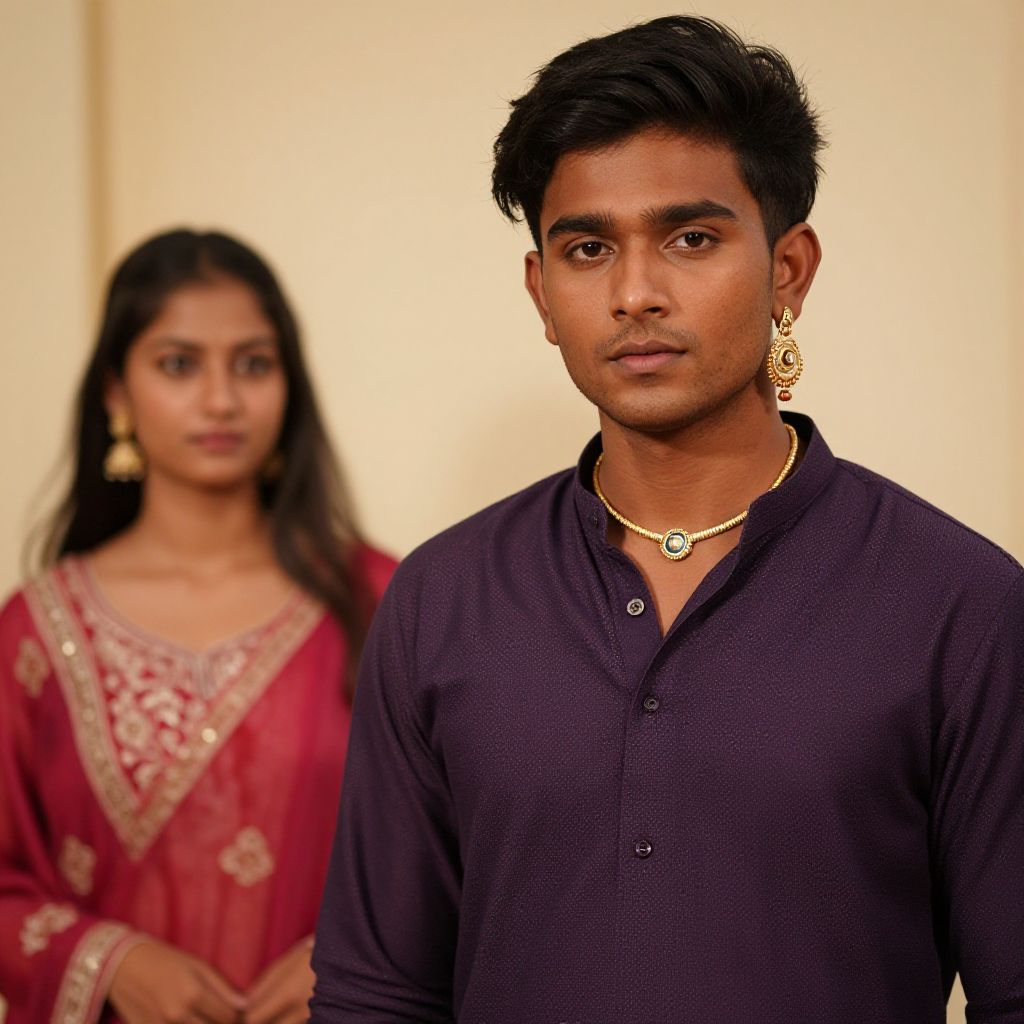 Photograph of a young Indian couple. The man, with medium brown skin, short black hair, and a serious expression, stands in the foreground wearing a dark purple button-up shirt and a gold necklace with a pendant. He has gold earrings. The woman, with medium brown skin and long dark hair, stands blurred in the background wearing a red traditional saree with gold embroidery and gold earrings. The background is a plain, beige wall. The image has a warm color tone.