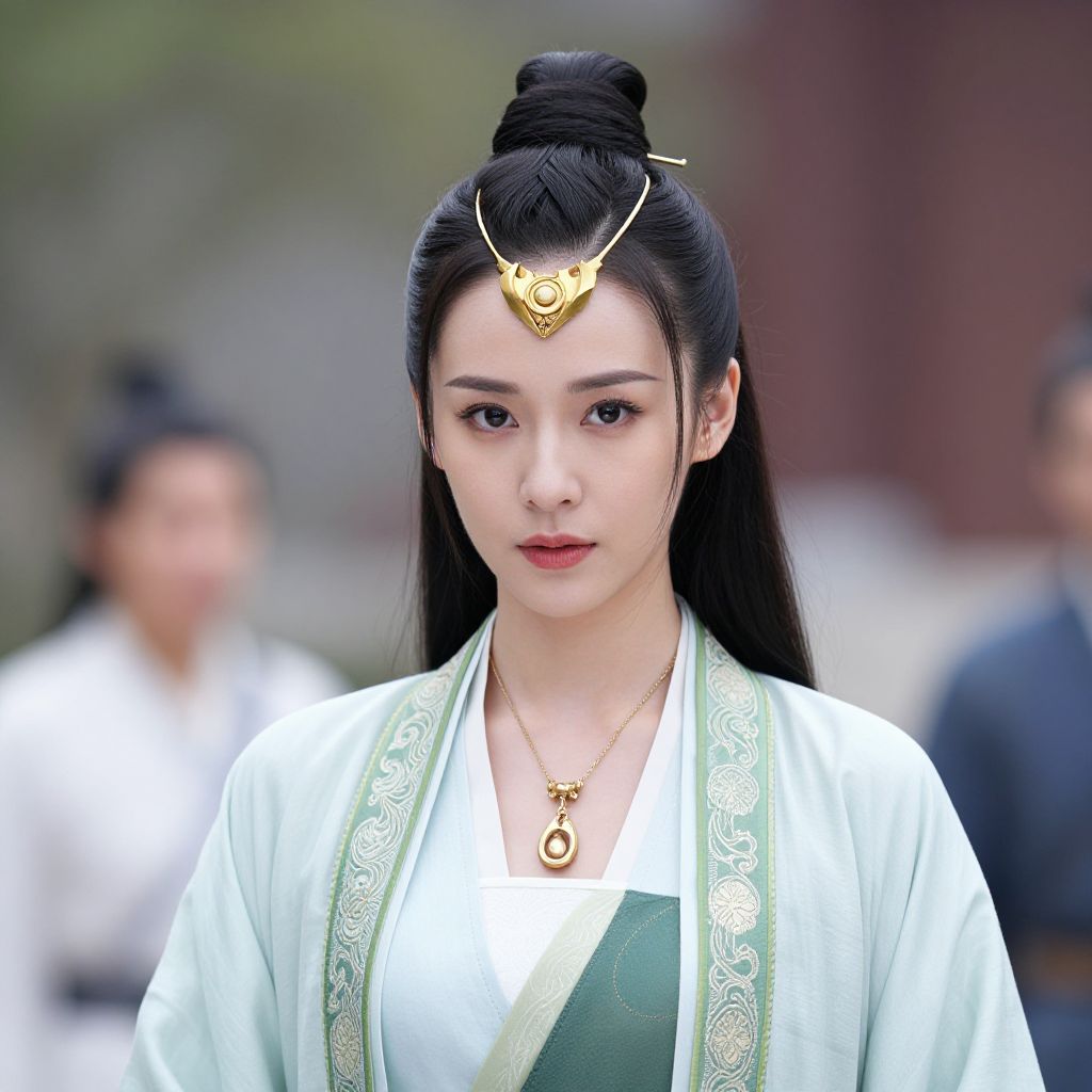 Photograph of an Asian woman with fair skin and black hair, styled in a traditional updo. She wears a deep blue, long-sleeved, traditional dress with a high collar and a red sash tied at the waist. Her outfit is adorned with long, dangling silver earrings and a silver necklace with multiple hanging pendants. She has red lipstick and a neutral expression. The background is blurred, featuring a red wall and indistinct figures. The image has a soft, natural light and a shallow depth of field, emphasizing the subject.