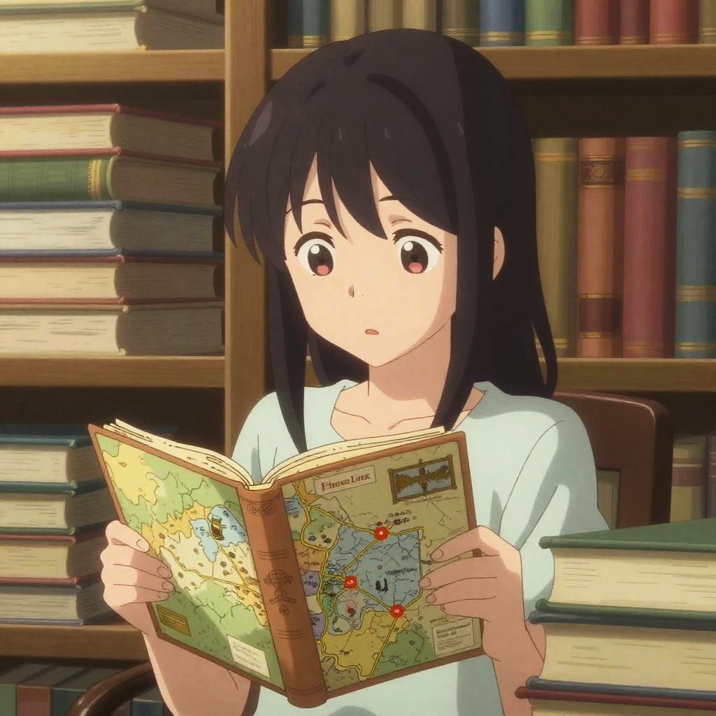 Anime girl revealing a secret map hidden inside a book, cozy library setting with warm lighting, surrounded by stacks of old tomes, delicate pastel color scheme, soft shading, subtle emotional expression showing curiosity and determination