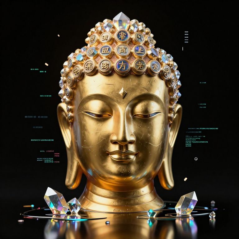 A golden 3D Buddha face emerges from a mirror, with iridescent crystals and ancient symbols, set against a black background, creating a cyberpunk, reflective, melting, and code-leak atmosphere.