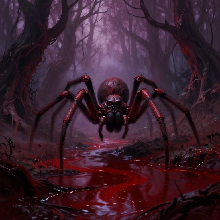 Digital art of a menacing, red-eyed, spider-like creature with black legs standing in stormy ocean, under a red moon and lightning.