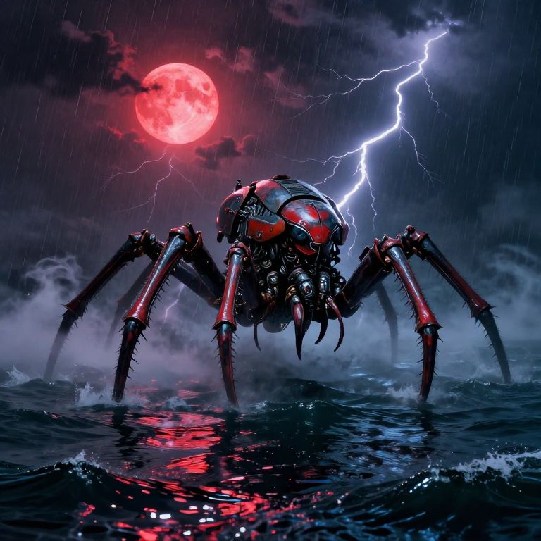 Imagine a colossal insectoid mecha emerging from the ocean under a stormy night sky, With multiple spider-like legs and a complex design, the machine rises through dark waters, casting intricate reflections in the rain-drenched waves, Fog drifts over the scene as lightning cuts through the sky, illuminating the dramatic, dieselpunk-inspired contours of its ominous silhouette, The contrasting colors highlight the menacing presence of this sinister machine, capturing the essence of sci-fi dread and tension against a turbulent, oceanic backdrop, contrast sky, red moon, lightning, total terror, lots of fine detail, vibrant, saturated, colorful, realistic reflections, from above, illustration, concept art, cinematic, futuristic, visionary, surreal, grimdark, disturbing, gigerpunk, close-up, hdr, Jakub rozalski, Simon Stålenhag Piotr Jabłoński Greg Rutkowski Guillermo del toro Ridley Scott H, Giger