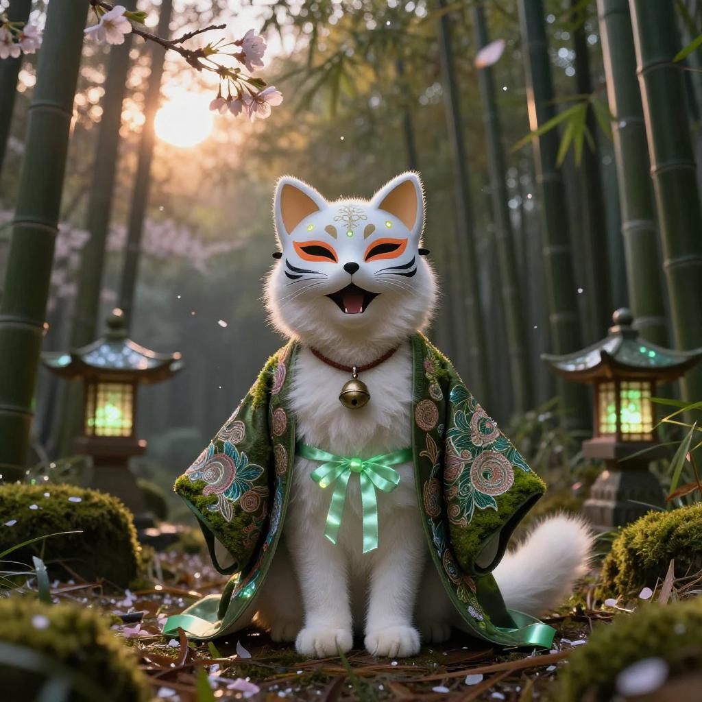 Best quality, masterpiece, ultra high res, raw photo, beautiful and aesthetic, deep shadow, dark theme, (photorealistic:1.4), white kitten with a tiny lacquered fox mask and faint bioluminescent whisker markings, wearing miniature moss-green haori embroidered with alloy filigree, bioluminescent silk ribbons and a small brass bell, soft smile, open mouth, closed eyes, ((chiaroscuro, backlight, sunset, petals floating)), graceful poise, evocative atmosphere, magnetic presence, captivating mystique, intricate zentangle patterns, astonishing level of detail, striking perspective, a chaotic masterpiece balanced by harmony, vibrant color palette, ((outdoors)), mossy bamboo grove threaded with neon-lit glass pagodas and rain-misted reflections, drifting sakura and bioluminescent petals against a distant futurist skyline, inspired by futurist architecture