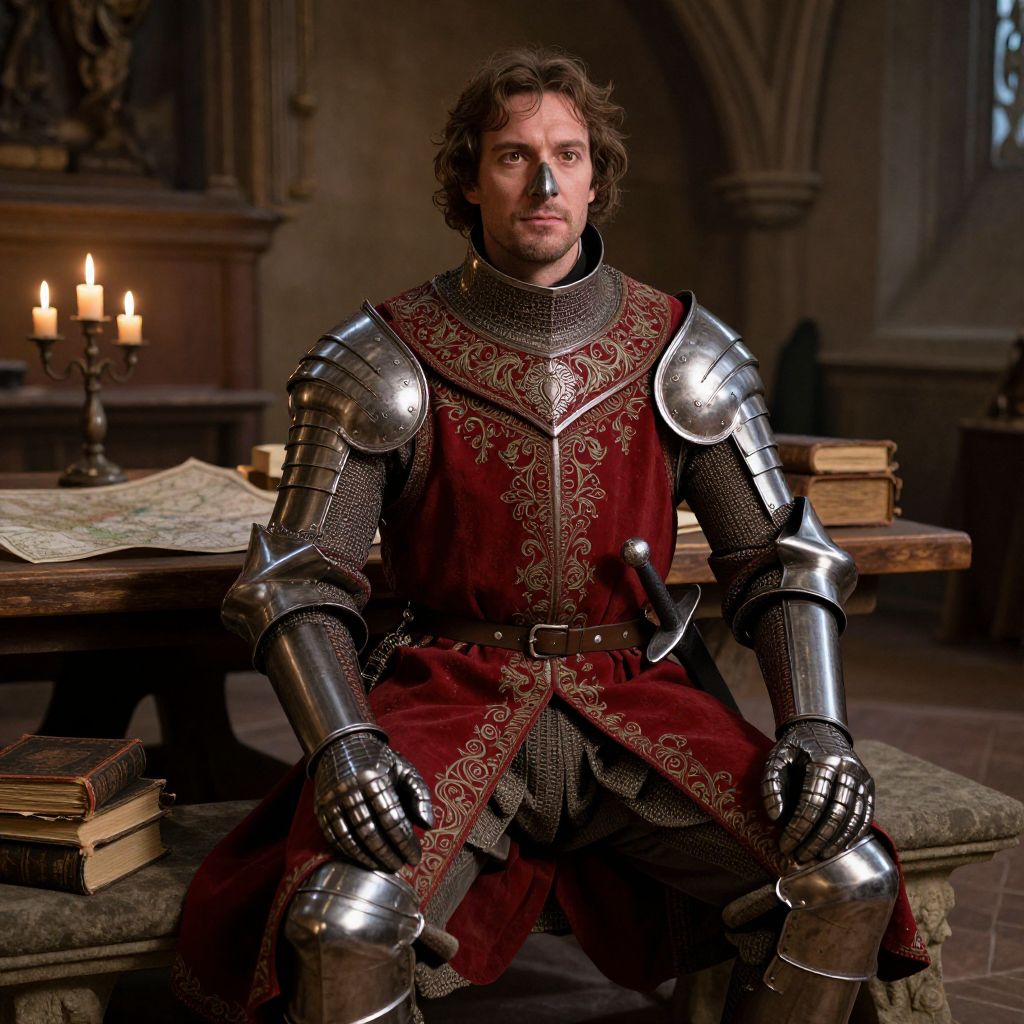 A realistic, cinematic portrait of a historical English knight in a fancy dress costume, seated on a stone bench in a medieval manor hall. The knight wears ornate plate armor with crimson and silver patterns, a long crimson doublet, and a silver buckled sword belt. The man has a rugged face with a strong nose, deep-set brown eyes, and a noble, calm expression. Behind him, candlelight flickers on a wooden table with maps and old books. The atmosphere is warm and intimate, with soft shadows and a rich, dim light.
