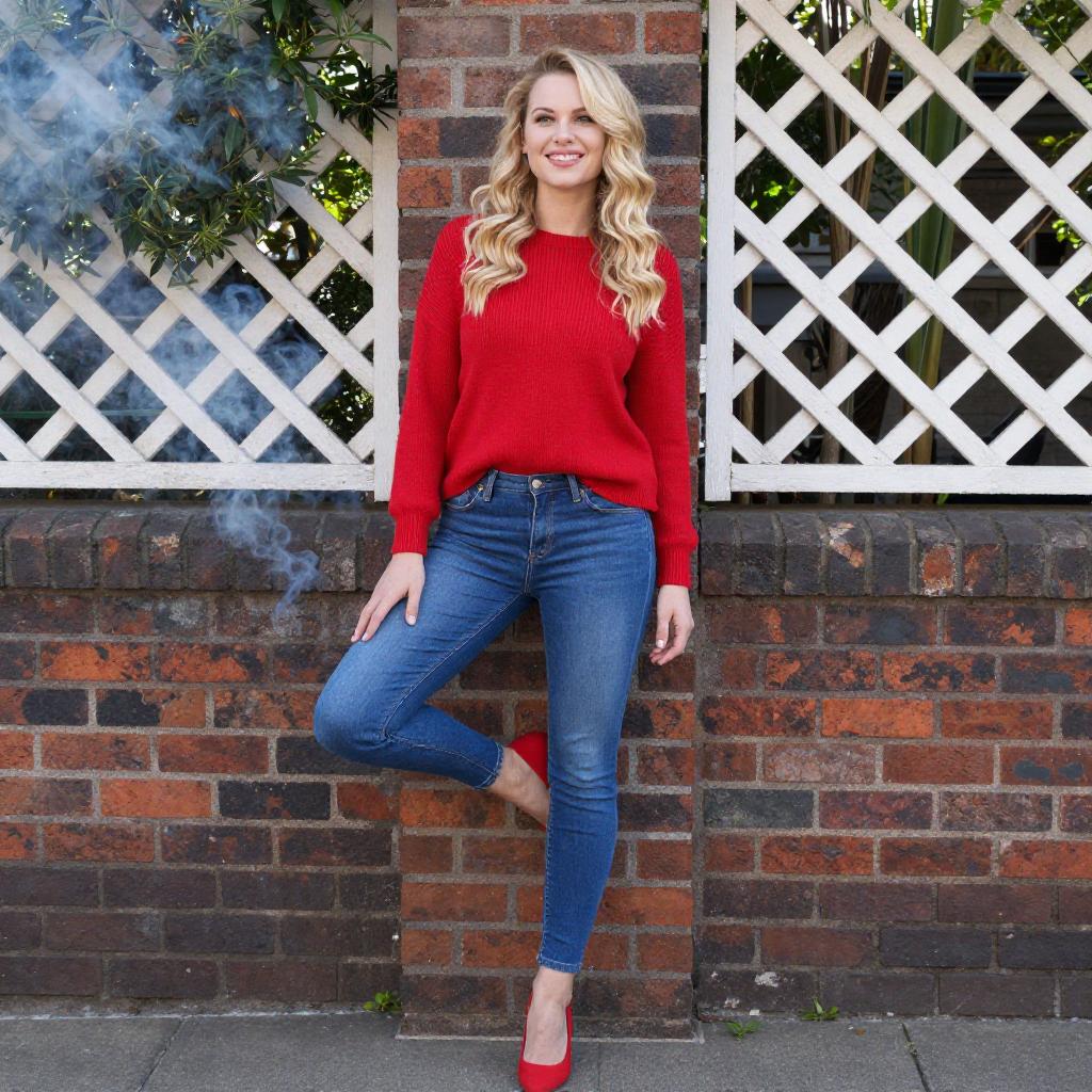 Photograph of a blonde woman with wavy hair, wearing a bright red sweater, blue jeans, and red shoes, standing on one leg against a brick wall with white lattice and greenery. She smiles, with blue smoke or light effect on the left.