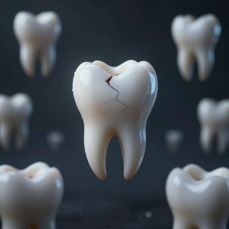 Photorealistic CGI of a cracked white tooth with visible fissure against a dark background, surrounded by blurred, identical teeth.
