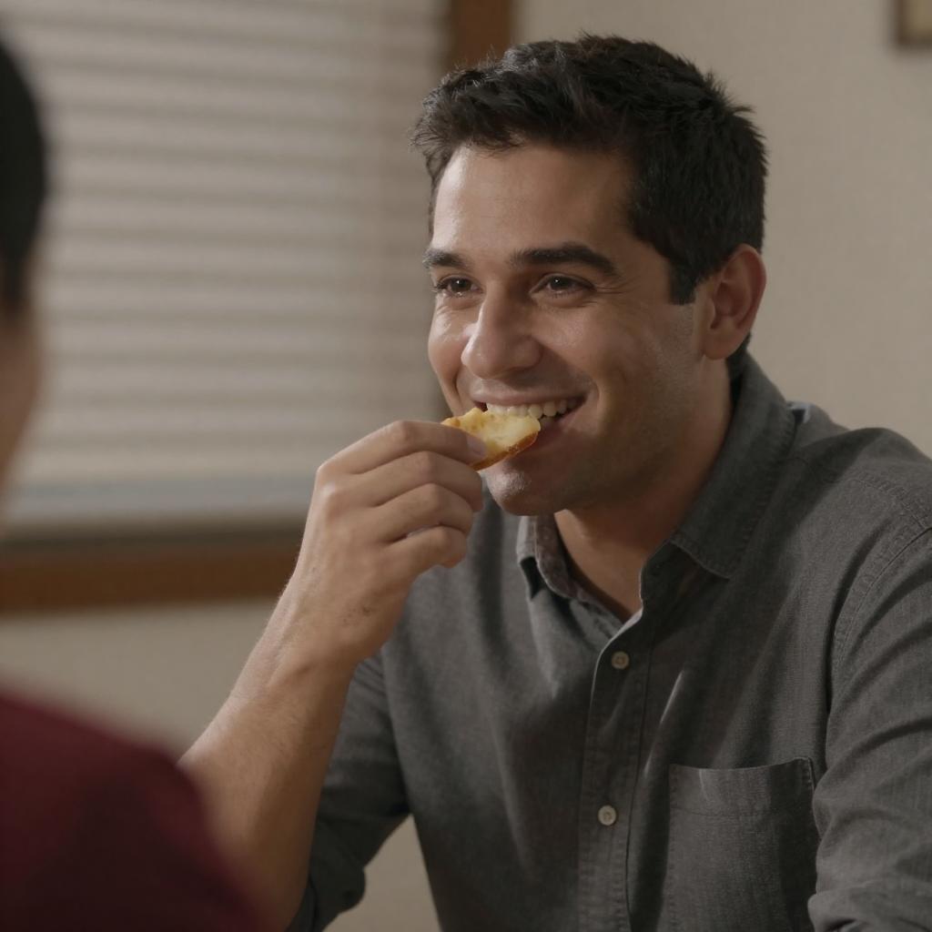 Photograph of a smiling man with short dark hair, wearing a gray button-up shirt, holding a piece of food close to his mouth. Warm indoor lighting highlights his joyful expression. Blurred background includes a window with closed blinds. Red object partially visible in the foreground.