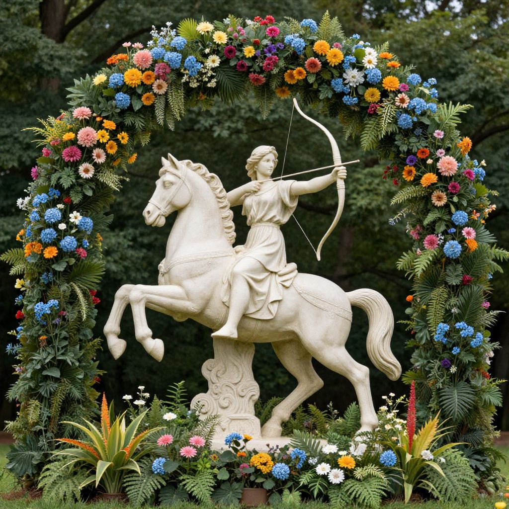 A detailed statue of a woman mounted on a rearing horse holding a bow, surrounded by a semi-circular arch of colorful flowers and green foliage set against a lush green background.