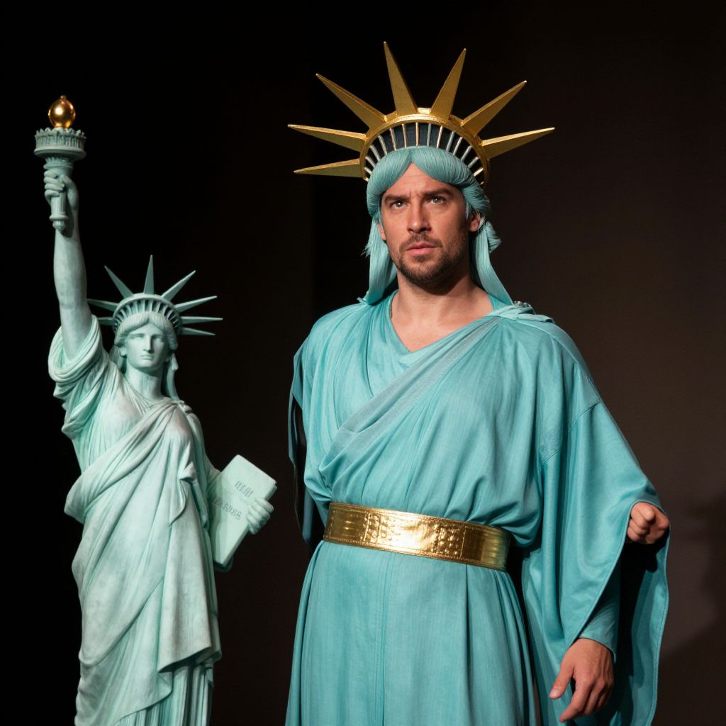 Portrait of a man wearing a detailed Statue of Liberty costume including a teal robe, golden belt, and crown with spikes, standing next to a small replica of the Statue of Liberty. The setting appears to be indoors with dramatic lighting emphasizing the costume's texture and facial expression.