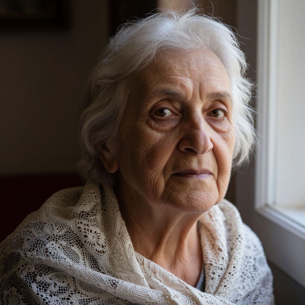 Photograph of an elderly woman with white hair, wrinkled face, and lace shawl, gazing thoughtfully out a window. Soft sunlight highlights