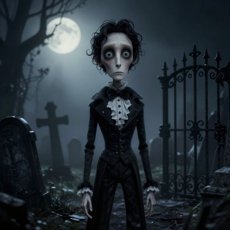 Tim Burton characters style eerie yet endearing whimsical figure wearing Victorian-era clothing, exaggerated features, pale skin, set against a foggy moonlit graveyard with crooked tombstones and twisted iron gates, moody shadows and a slightly macabre vibe.