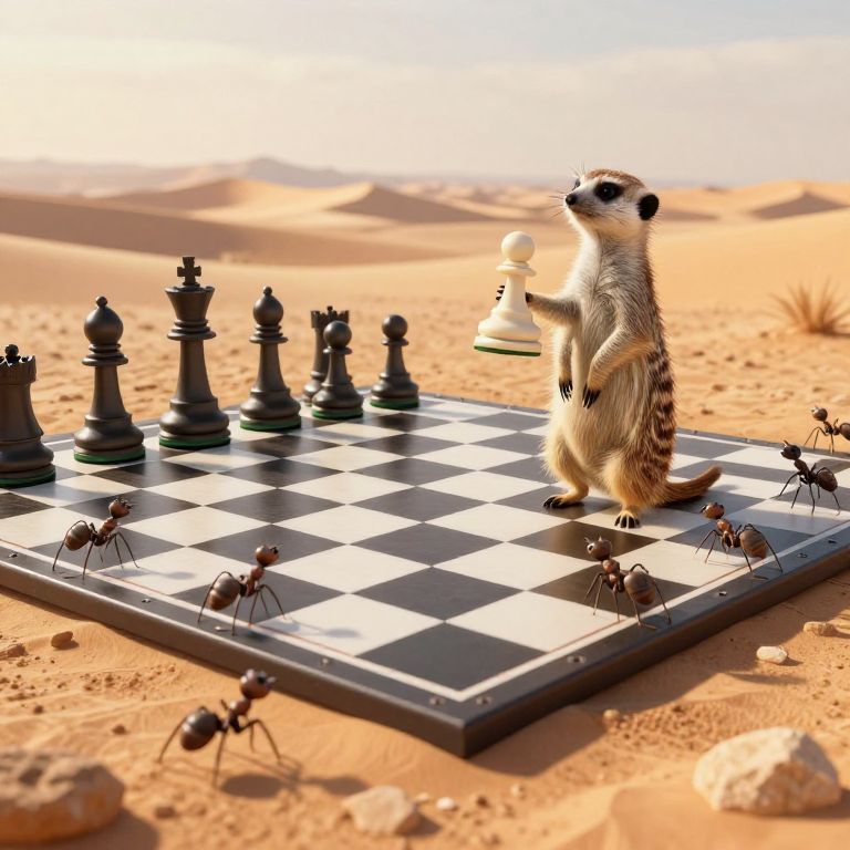 A surreal 3D-rendered scene depicts an enormous chessboard spanning a desert landscape, where ants navigate as pawns and a meerkat strategically holds the queen piece, blending whimsical fantasy with hyper-realistic detail under golden-hour lighting.