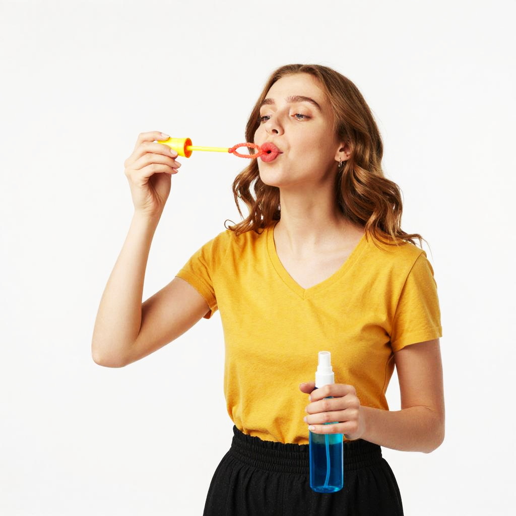 Portrait of a young woman with light brown hair wearing a yellow V-neck t-shirt and a black skirt. She is blowing a bubble using a yellow and red bubble wand in her right hand, while holding a blue spray bottle in her left hand. The background is white, emphasizing the playful and bright atmosphere of the image.