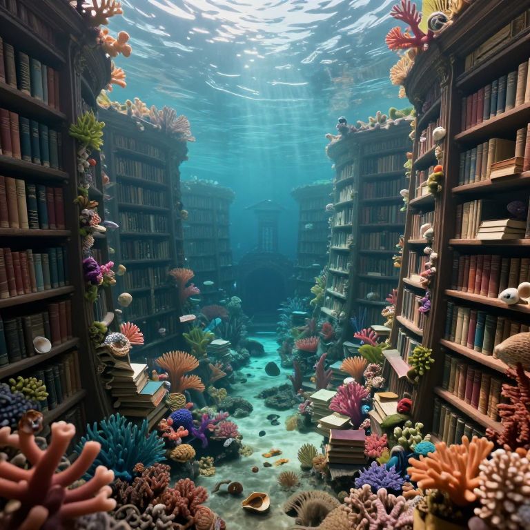 A surreal digital artwork depicting an expansive Victorian-era library transformed into a whimsical underwater paradise. Towering bookshelves metamorphose into vibrant coral reefs teeming with exotic marine life. The aerial perspective highlights the ethereal fusion of paper and water as sunlight filters through translucent waves, casting dappled light on ancient tomes adorned with seaweed and shells. This fantastical composition instills a sense of wonder and curiosity about the uncharted depths of knowledge and imagination, reminiscent of dreamlike landscapes by surrealist artists.