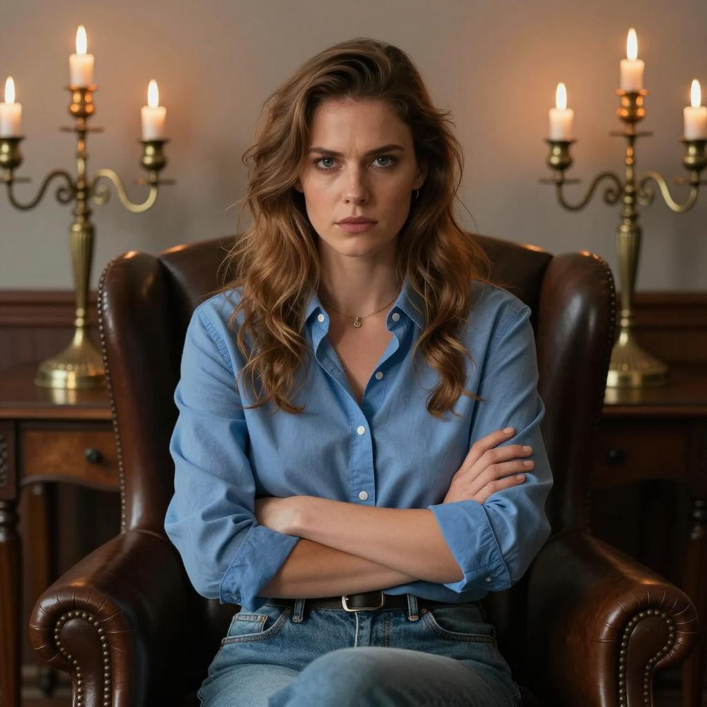 Portrait of a woman with shoulder-length wavy brown hair and green eyes, holding a vintage film camera. She is wearing a dark blue button-up shirt and a brown camera strap. The background is a plain, softly blurred light gray, focusing attention on her serious expression and the camera.