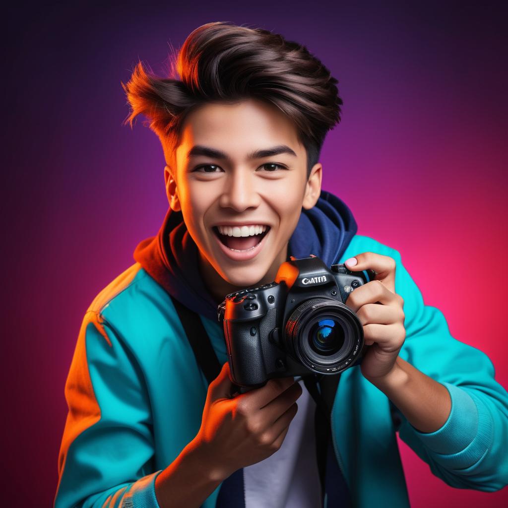 Create a striking portrait of a young male photographer with a playful smile capturing the essence of his excitement and passion. Use a rich color palette dominated by bright energetic colors and dramatic lighting that enhances the emotional depth of the scene.