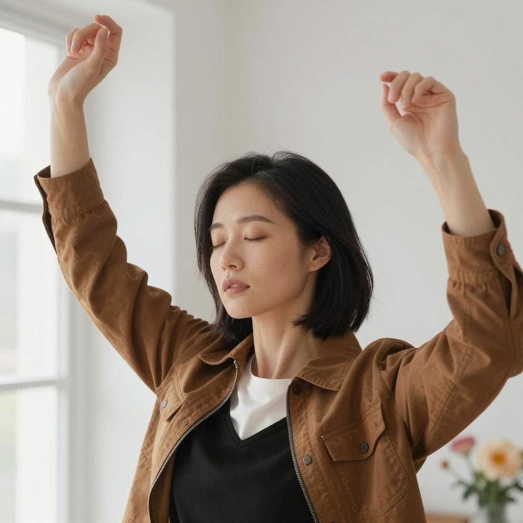 Asian woman with long black hair, closed eyes, light green shirt, calm expression, side profile, blurred green and brown background.