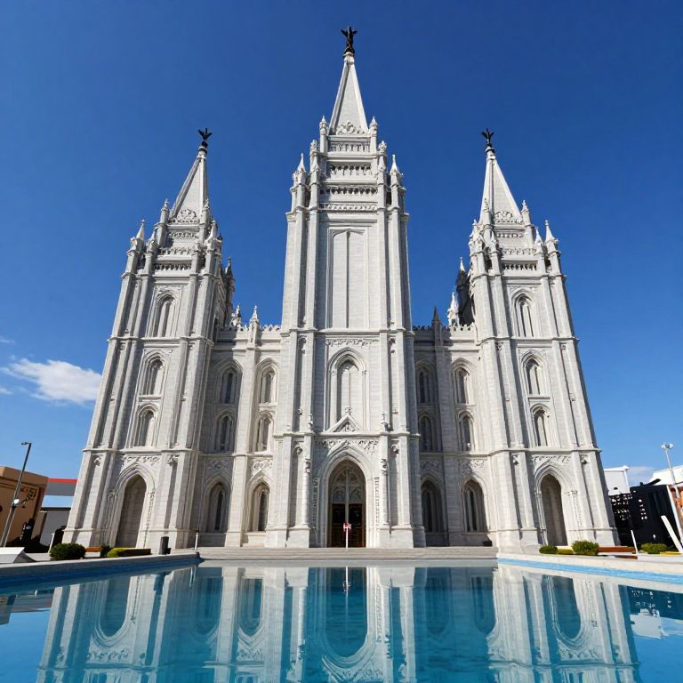 A stunning 3D-rendered depiction of the Salt Lake Temple showcases its intricate spires and Gothic architecture, set against a vibrant blue sky with dramatic lighting and mirrored reflections in the surrounding pool, blending realism with digital artistry.