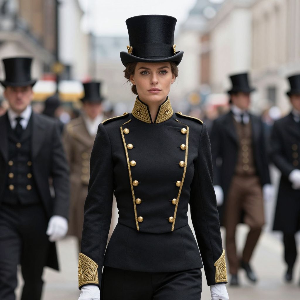 Elegant woman in Victorian attire stands confidently in bustling London streets, adorned in a black top hat crowned with gold accents, a tailored military-style jacket embellished with golden buttons and trim, and surrounded by similarly dressed figures in a historical urban setting.
