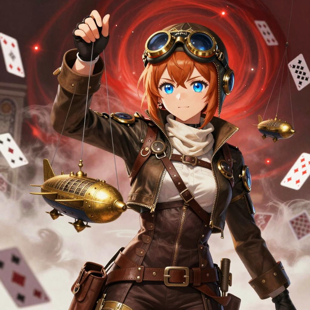 Anime style female character with auburn hair and sapphire eyes, wearing a steampunk pilot jacket with brass goggles, an aviator scarf and leather harness, holding miniature brass airship models suspended on thin wires, surrounded by floating playing cards. The scene features a dynamic swirling smoky background with bright red and white highlights, intricate costume details, sharp expressive eyes, and an energetic and magical atmosphere. Rendered in high contrast and vibrant colors as detailed digital art.