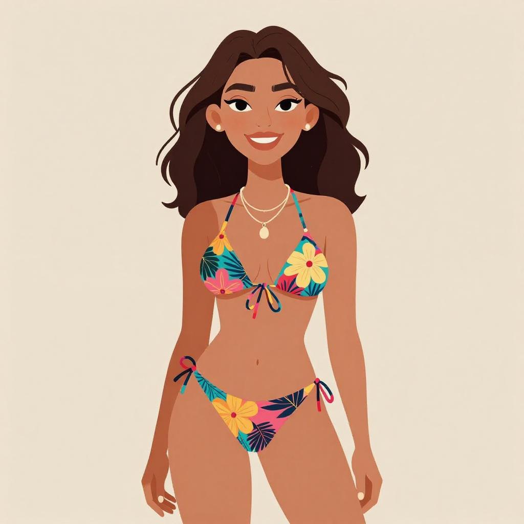 Woman with pretty face and pretty hair. smiling Woman, tropical resort style, two-piece bikini in a floral pattern with a mix of warm and cool tones, triangle top with adjustable tie at the chest, thin shoulder straps, matching high-waisted bikini bottoms, layered necklaces, one with a pendant, a neutral beige studio background. --sref 1467