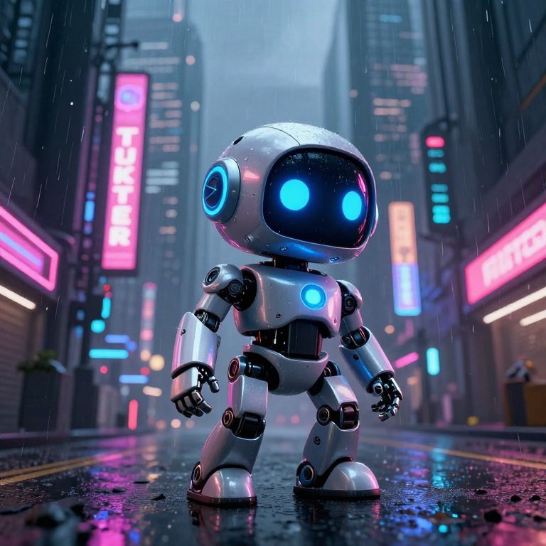 This is a digital CGI image featuring a small, futuristic, white robot with glowing blue eyes and neon accents standing in the middle of a rainy, neon-lit city street. The robot has a rounded, dome-shaped head with a black screen for a face and blue circular lights on its shoulders and chest. The background consists of tall, illuminated skyscrapers with vibrant pink, blue, and white neon signs, adding a cyberpunk aesthetic. Raindrops are visible, adding a wet, reflective texture to the street surface. The scene is set at night, with a misty atmosphere and a sense of futuristic urban environment.