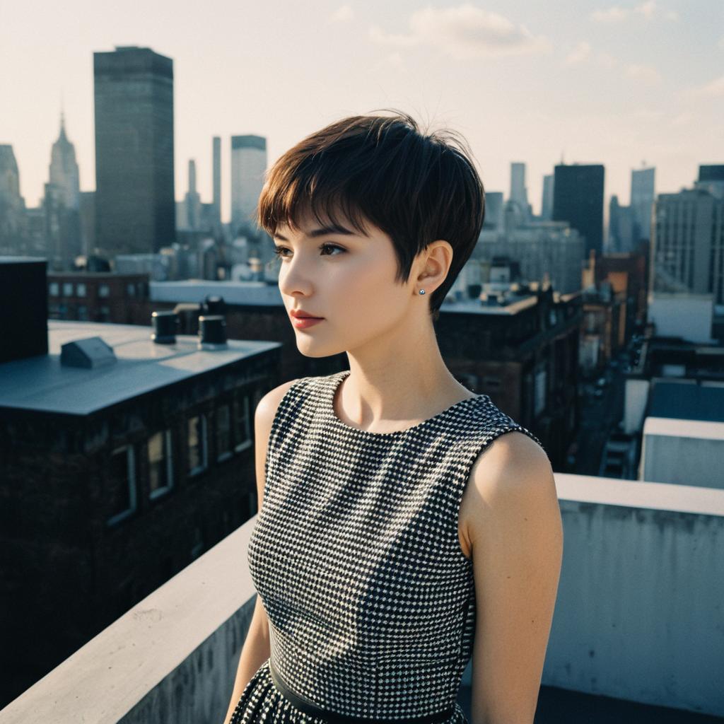 Pixie Cut hairstyle on woman, wearing elegant dress, in city rooftop, captured in fashion editorial style with studio light.